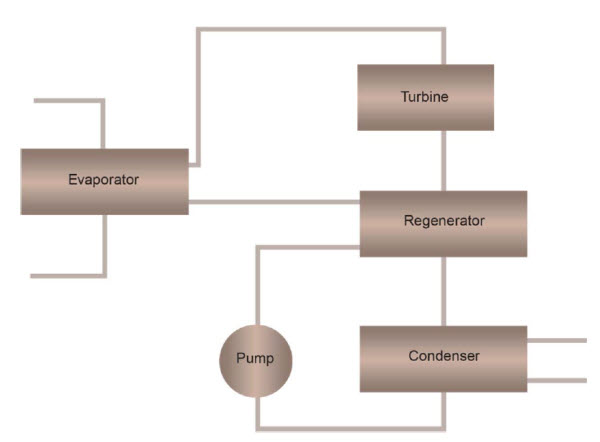 Das Organic Rankine Cycle (ORC)-System nutzt ein Prozessmedium wie ein Kältemittel oder ein Ammoniak-Wasser-Gemisch mit niedrigem Siedepunkt, um aus einer Niedertemperaturwärmequelle Dampf zu erzeugen. Der Dampf treibt Turbine und Generator an, durchläuft dann Rekuperator und Kondensator. Eine Pumpe fördert das Prozessmedium anschließend durch den Rekuperator zurück zum Verdampfer.