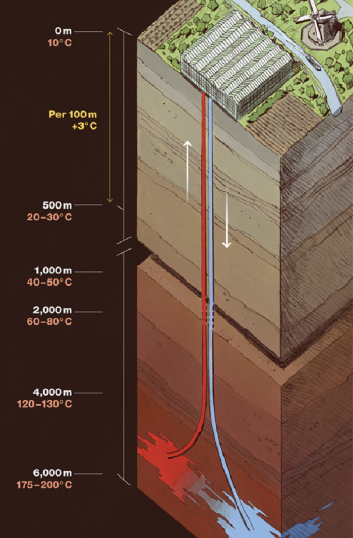 Für die Nutzung von Erdwärme wird die Hitze aus unterirdischen Wasserressourcen entzogen. Je tiefer das Wasser unter der Erde ist, desto heißer ist es in der Regel. In den Niederlanden pumpen Erdwärmeanlagen warmes Wasser aus Tiefen von mindestens 500 Metern. Nach der Nutzung wird das abgekühlte Wasser wieder unter die Erde gelassen.