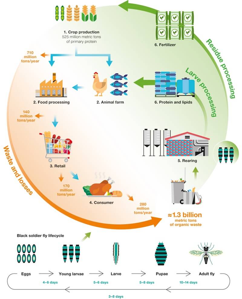 Die Larve der Schwarzen Soldatenfliege ist bekannt für ihren kurzen Wachstumszyklus und die große Leistungsfähigkeit beim Abbau organischen Materials. Deshalb hat BITS sie für die Verarbeitung von Insekten-Protein ausgewählt.