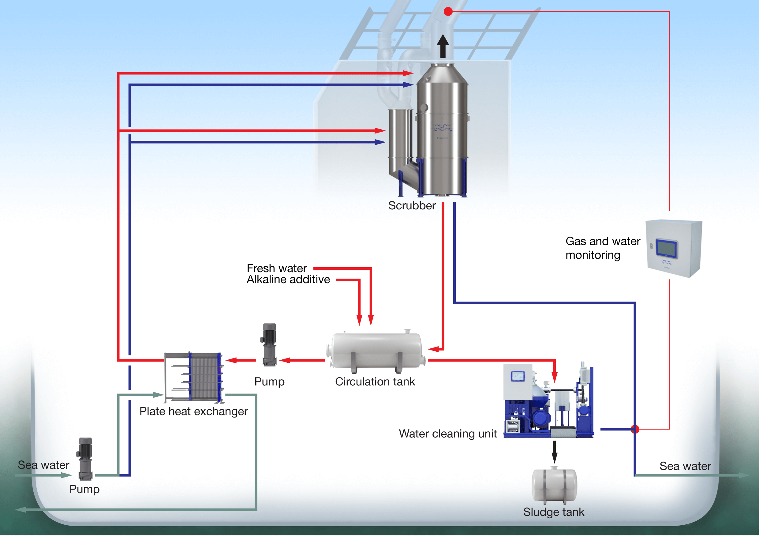 An Alfa Laval PureSOx scrubber system can be configured in three different operating arrangements: open-loop, closed-loop or a combination of these two, hybrid.