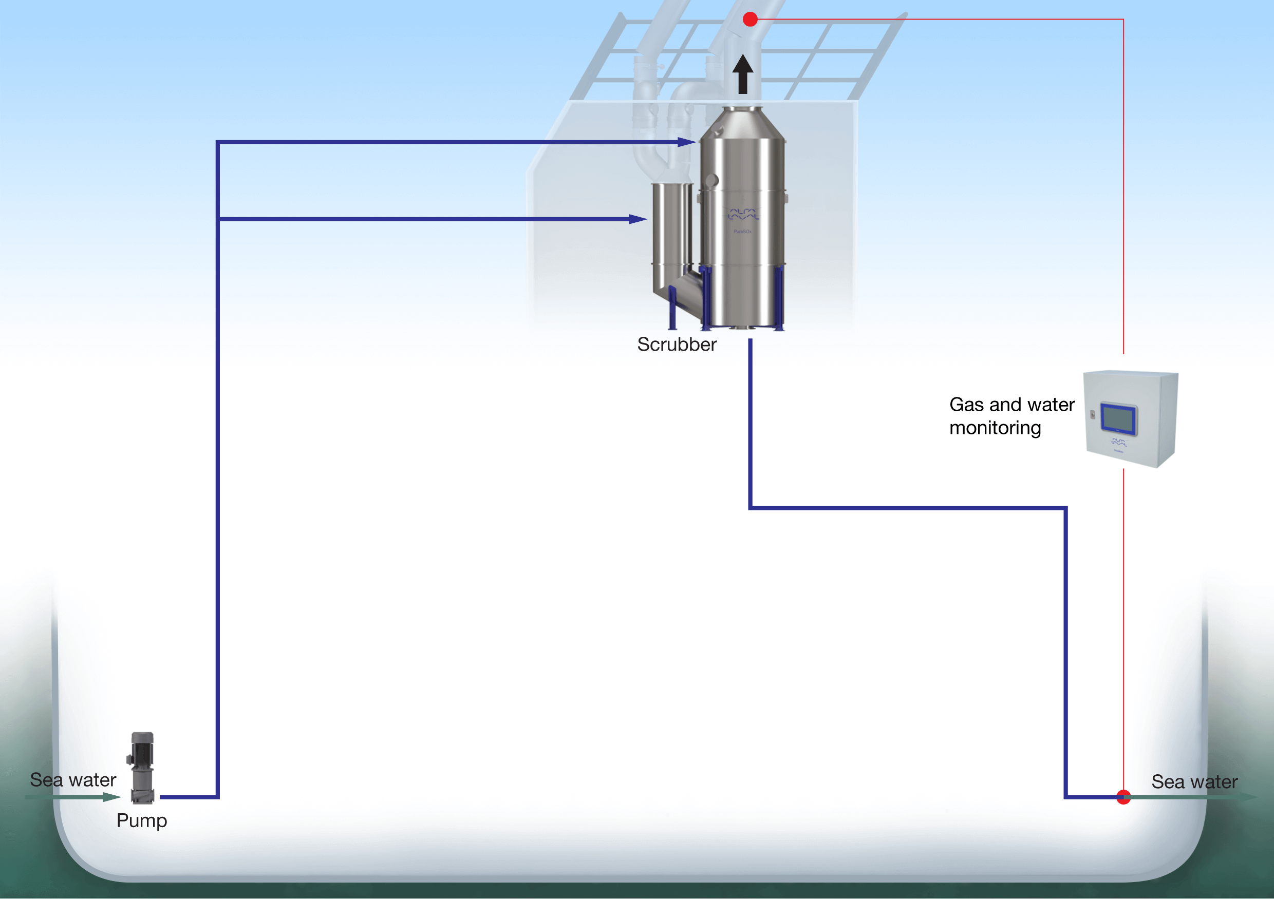 In an open-loop scrubber, seawater is used to scrub the exhaust gas. Once the water has passed through PureSOx, it is discharged back into the sea, in compliance with IMO regulations. This configuration has the lowest investment and operating costs, but its use may be limited by low water alkalinity or local water discharge regulations.