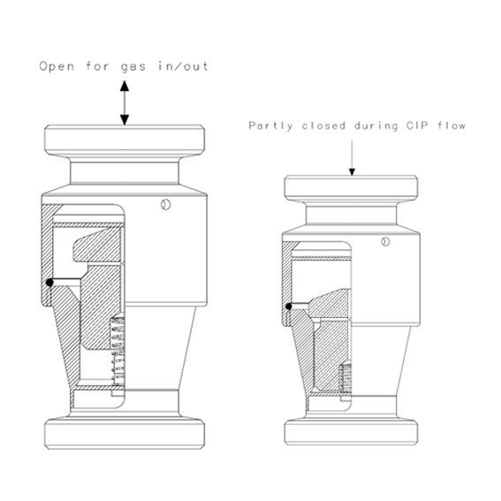 Die Edelstahlfeder hält den hygienischen Ventilkörper offen, sodass der Gasstrom in beide Richtungen ungehindert durch das Ventil fließen kann. Um das Ventil zu schließen, wird CIP-Flüssigkeit gegen die Federkraft in Gegenrichtung eingeleitet. Durch den Druck der Flüssigkeit schließt das Ventil. Eine spezielle Bohrung im Ventilkörper sorgt für die hygienische Reinigung aller Ventilteile.